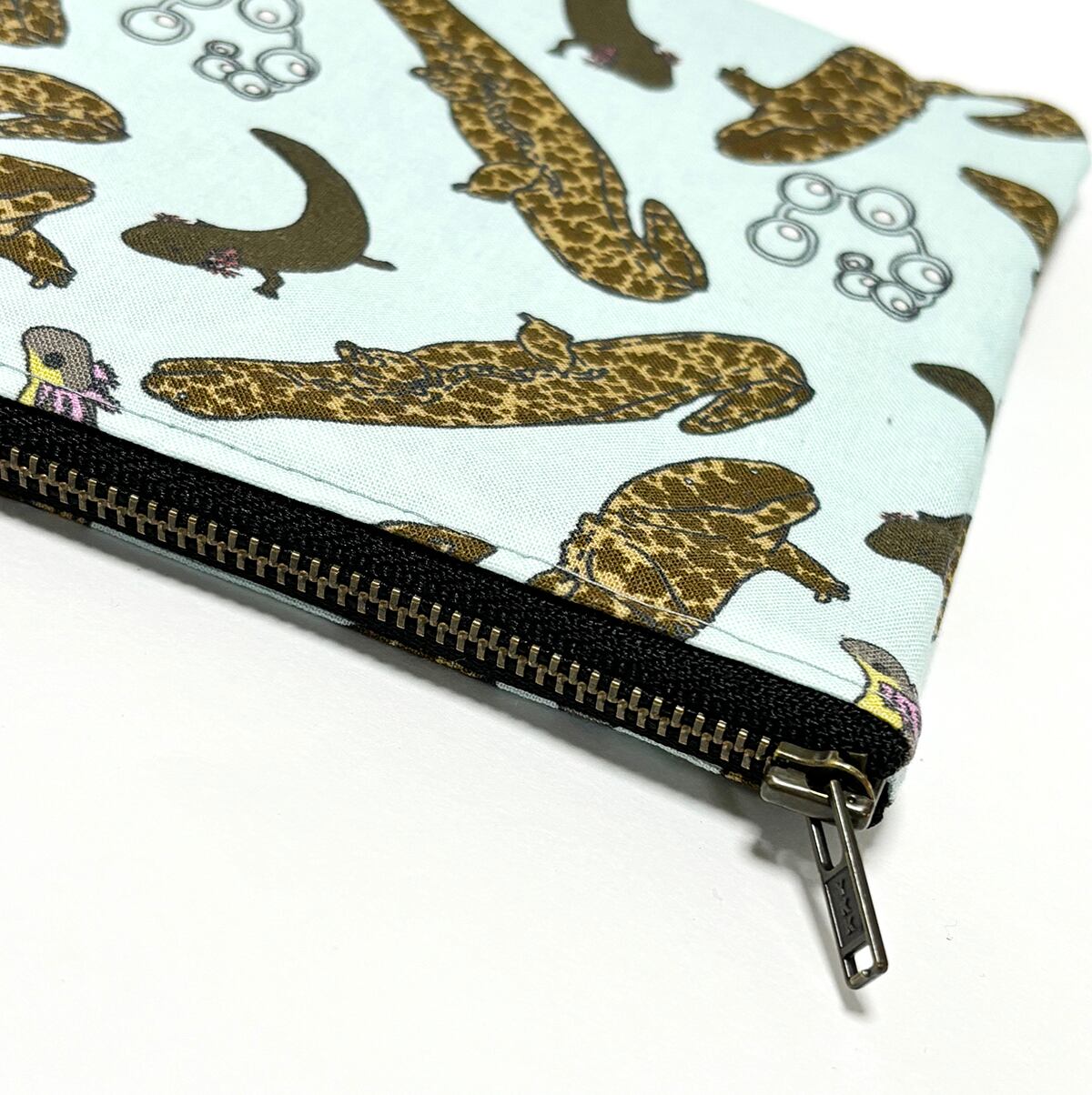 アカハライモリの発生をテーマにしたパターン生地で作ったポーチです。